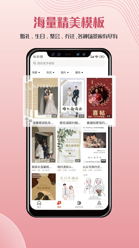 模板丰富,涵盖婚礼电子请柬、满月酒宝宝百日(百天)、生日、寿宴、聚会通知、乔迁请柬、商务邀请(会议|活动|开业)、节日祝福、放假通知、招聘简历等海量免费模板。