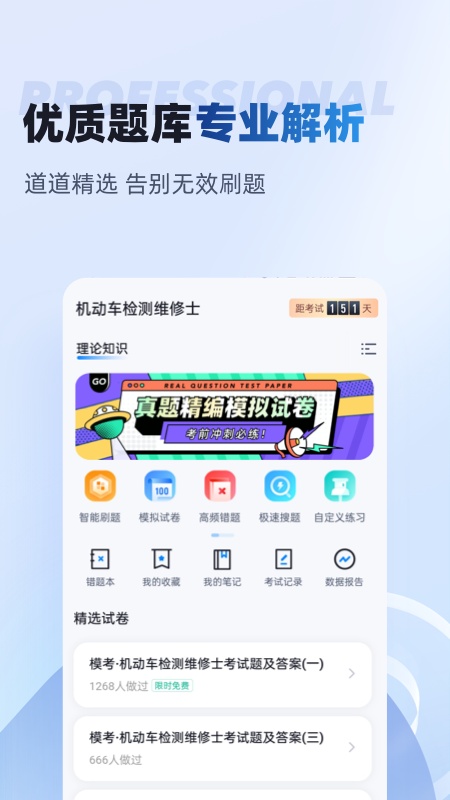 机动车检测维修士题库内含考点练习,全国通用卷以及地区卷模拟练习,以及按照固定考试比重的随机式的抽题的真题考场,成绩单实时记录考试数据,一点一滴的反馈考生近期学习状态以及自我正确率的提升,大大的给予考生通过考试的信心。 软件功能