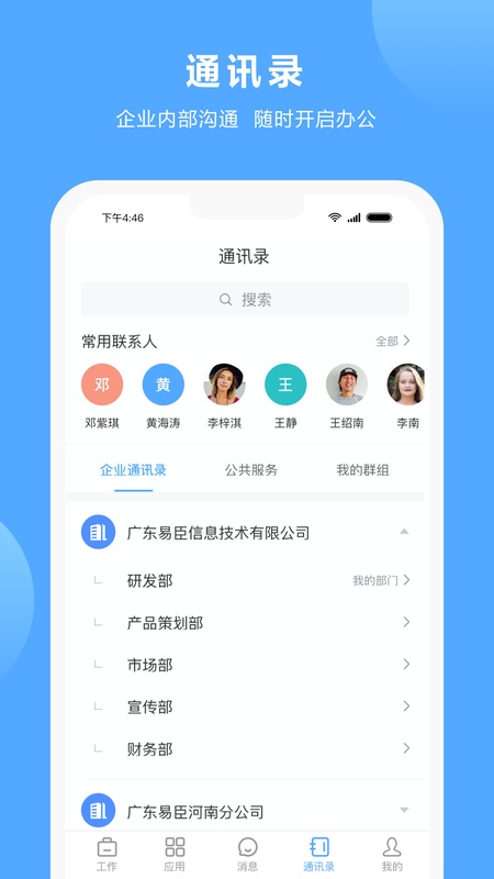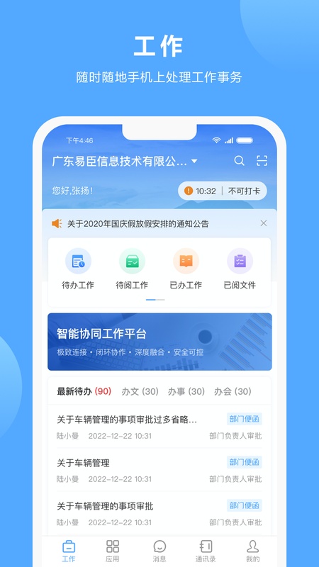 用户可以通过产品中心选择适合自身需求的办公功能,如政务办公、智慧协同等。借助易办公的各项功能,在日常工作中可实现团队协作、流程管理等操作,让工作变得更便捷、更高效、更智慧。