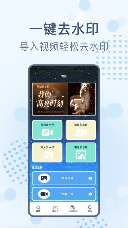 视频剪辑去水印超实用的去水印视频剪辑工具,支持图片、视频的添加和去除水印。图片、视频压缩,视频剪辑、涂鸦、视频滤镜。各种剪辑教学,还带海量热门影视资料资讯。 应用功能