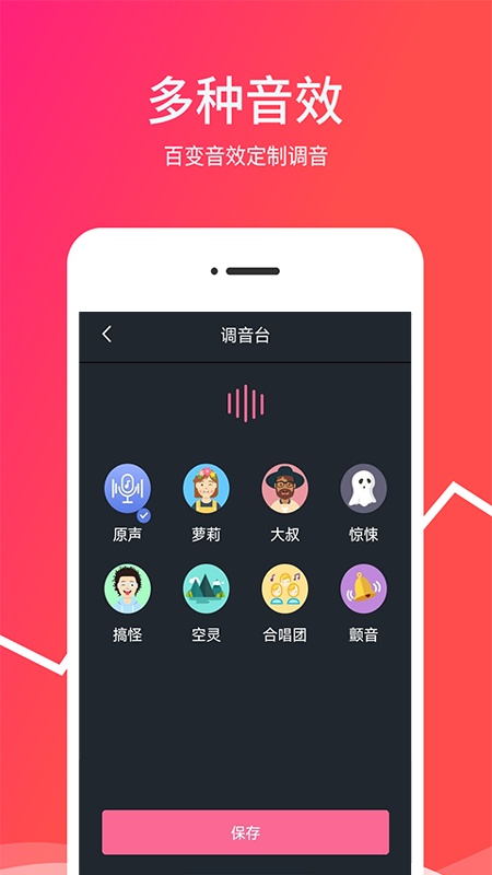 平台具有海量真人语音包,包含男女生对唱、成功学鸡汤、软件提示音、清唱语音、私聊语音等,适用于各大游戏和聊天软件。具备录音变声功能,能以全新方式让声音妙趣横生,添加萝莉、大叔、搞怪、惊悚等特效。有多种玩法,支持一键保存,还能分享到QQ、微信、微信朋友圈。