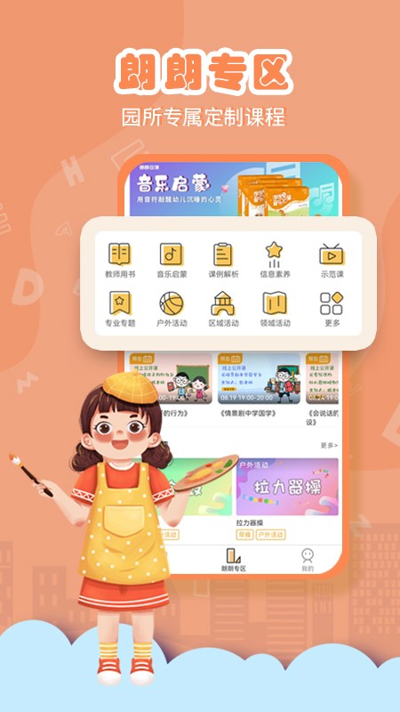 朗朗云课采用\"8+2+x\"体系模型,旨在为幼师提供系统实用的方案和工具,含个性化教育教学、班级运营管理、家园共育方案、高效率实用工具等,助力每位幼师全能高效工作、实现专业化成长。