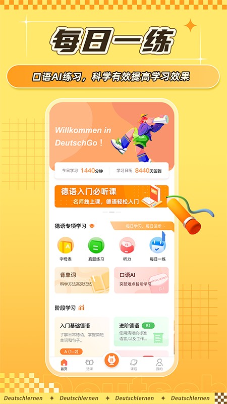 具备AI智能学习,每日一练能跟着AI老师沉浸式高效学德语;有A1 - C2系统课程,由名师打造,助各阶段高效达成学习目标。
