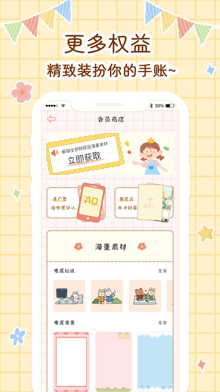 从丰富素材中挑选免费贴纸、信纸背景等装饰手帐。