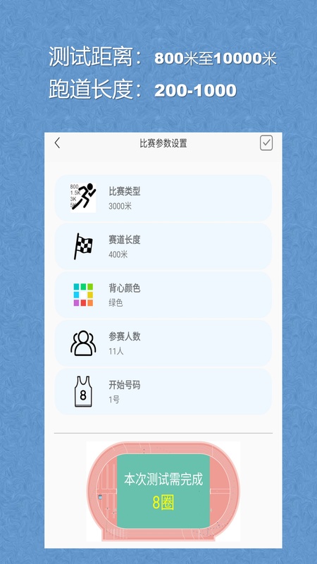 可根据场地大小计算圈数,支持800米至10000米的测试,支持200米至1000米的场地。