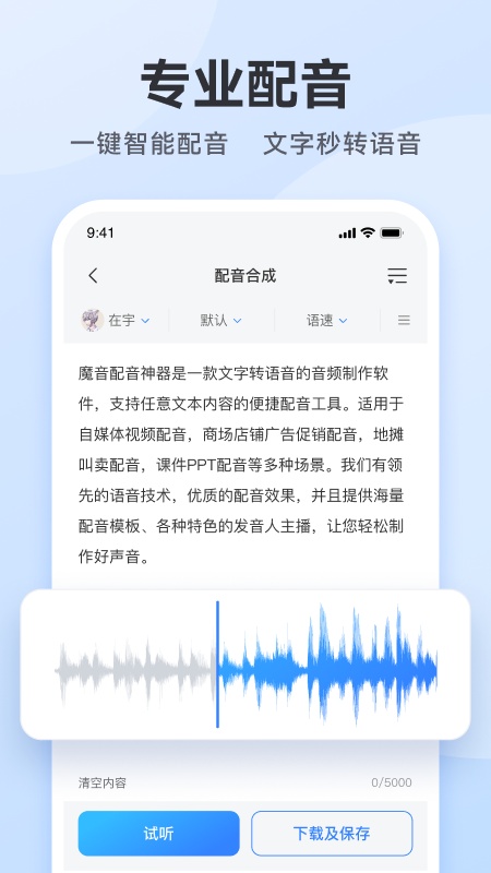 素材丰富:海量样音文案模板,优质背景音乐,可打造专属配音效果。