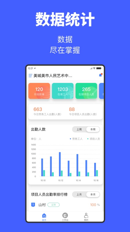 数据统计:支持查看当前在场工人、出勤人数、记工数据等信息