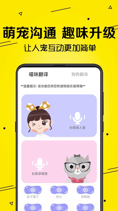 该App具备声音变换功能,可将声音变换为猫语和狗语,以此获得猫咪和狗狗的注意力,增加与它们的亲近感。