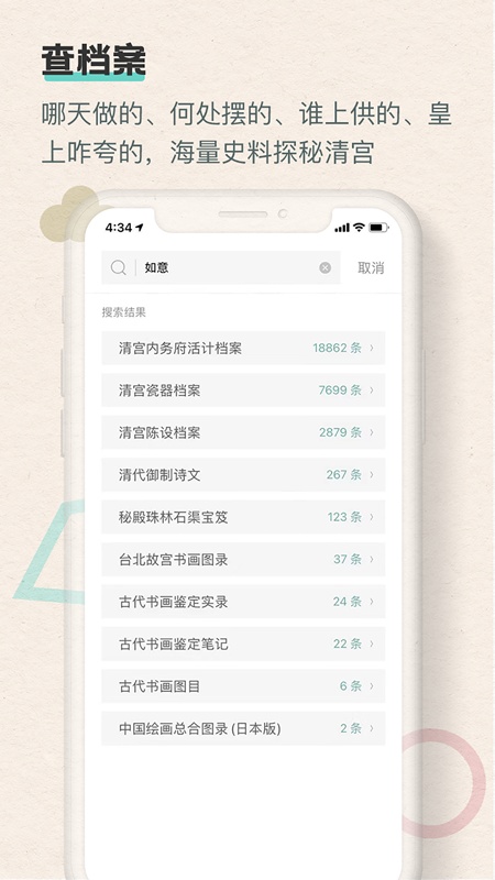 【档案\\文献】:档案-重要清宫原始卷宗,数据化检索清宫完整收藏、陈设及造办处制造纪录,逐件溯源皇家宝藏。文献-海量权威中国古代书画及古器物的鉴定汇编,全方位检索艺术品考证细节。