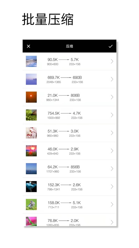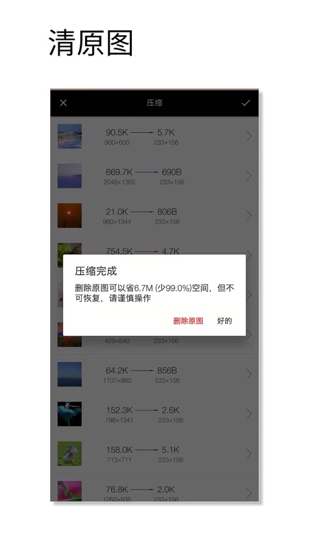 图片压缩狂魔,支持大批量图片一起压缩,图片文件格式转换,还能自定义生成的图片宽高长度,对图片清晰的也能分别调整。压缩效果好,速度快。 应用功能