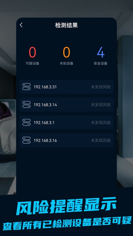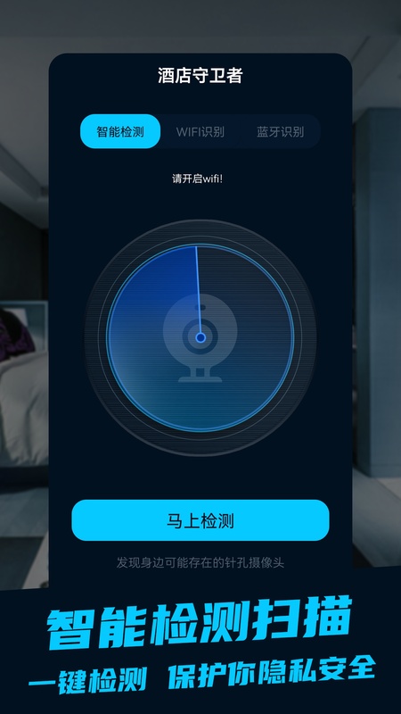 酒店安全宝,新一代设备探测技术,当前环境实时检测是否存在可疑设备,防隐私外泄。 应用功能