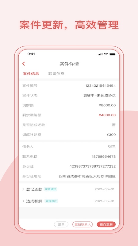 提供给各人民调解员承接银行、消费金融机构借贷纠纷类调解案件,更新案件调解状态的应用。 APP功能