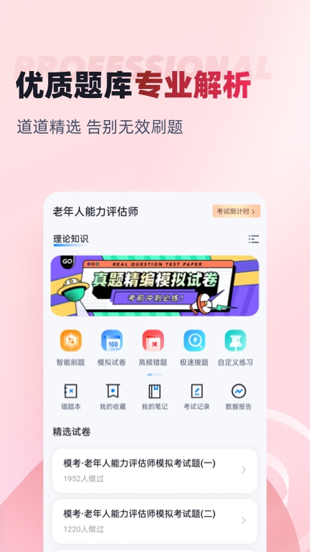 老年人能力评估师题库内含考点练习,全国通用卷以及地区卷模拟练习,以及按照固定考试比重的随机式的抽题的真题考场,成绩单实时记录考试数据,一点一滴的反馈考生近期学习状态以及自我正确率的提升,大大的给予考生通过考试的信心。 APP功能