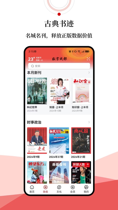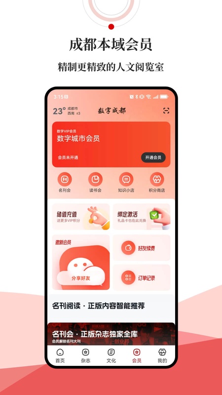 打开数字城市成都客户端,在客户端内浏览关于成都的各类资讯,如购房落户政策、高新技术产业和休闲文化等内容。若想享受更多优质服务,可立刻开通会员,之后就能沉浸式阅读高质量文章,体验名刊汇聚名刊会的精彩内容。