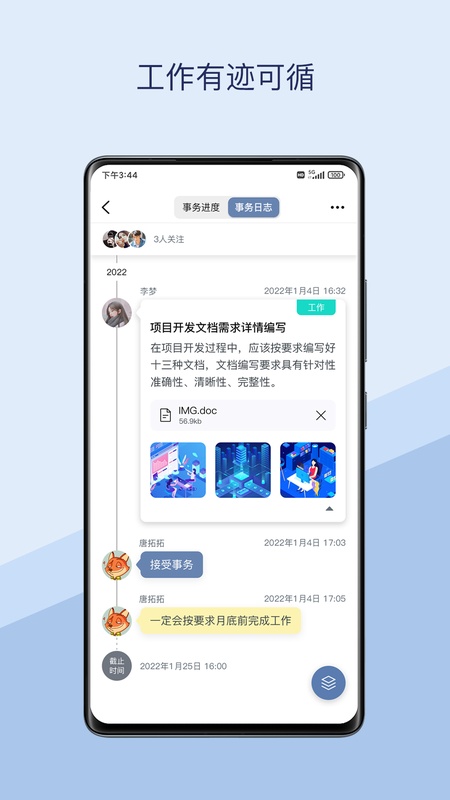 团队成员在快叮事务管理APP中接收各自的任务,完成后系统会更新进程状态,事务发起人可随时查看。在创建事务时可设定截止时间,当临近截止时,系统会自动提醒相关关键人。