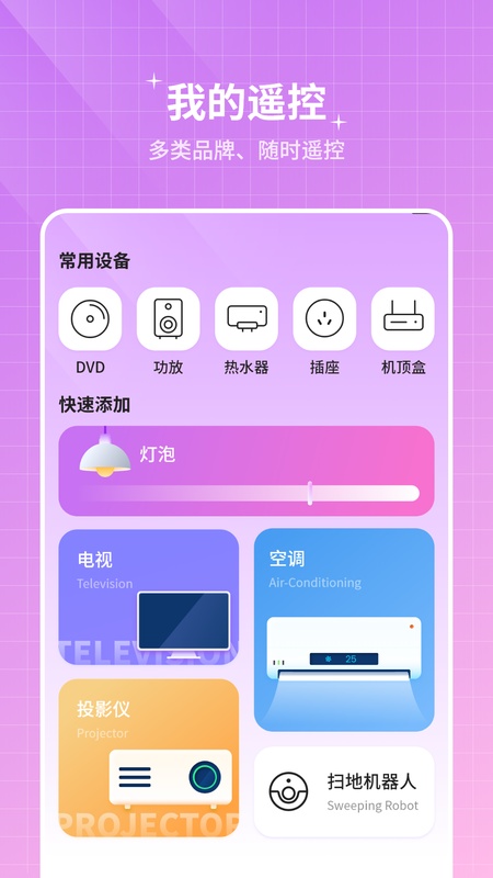 若您的手机不具备红外功能,则该遥控器APP需要匹配外部设备才可以正常使用。 App功能