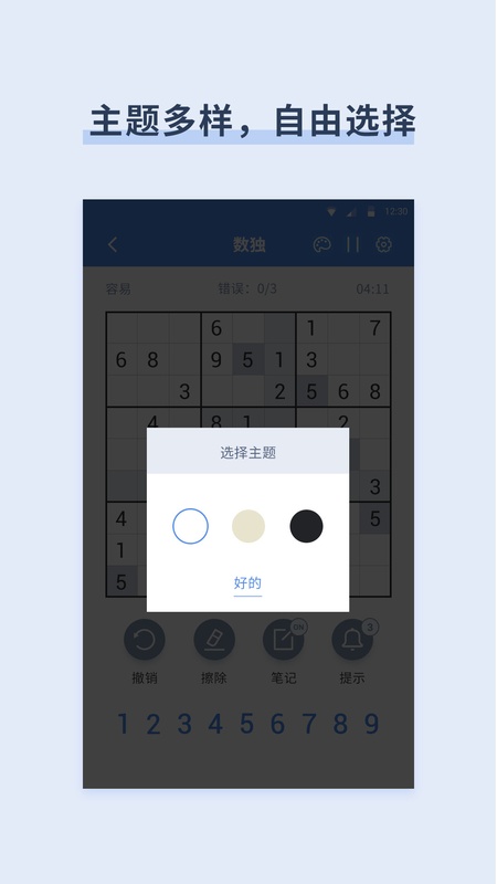 1 数独题目丰富,分简单,中级,困难,专家四个级别,不同等级的玩家可以自由选择