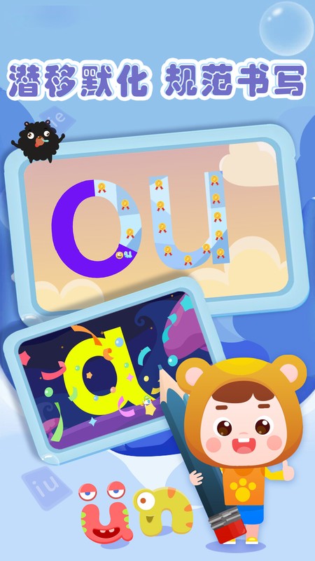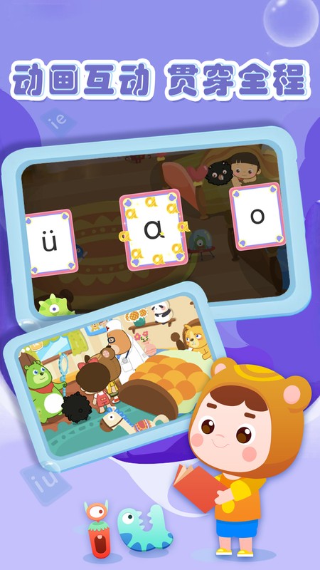 专为3-8岁孩子定制,遵从儿童认知发展规律,动画+创意互动方式引导孩子主动学、轻松学,63个拼音小怪物形象,有趣好记;智能AI语音测评书写识别,让孩子主动发音,学会书写。还有丰富原创的动画剧情和强大的学习功能丰富学习体验,为孩子的拼音学习打下坚实的基础。 功能特色