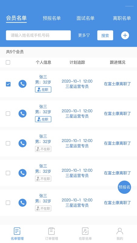 2、名单管理-预报名单、面试名单、离职名单:默认显示今天的数据,点击日期可查看全部