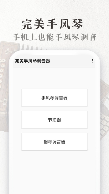 完美手风琴调音器支持手风琴、钢琴、节拍器等多种调音应用软件,不论是手风琴小白还是演奏大师,都可以随时随地学习手风琴调音。