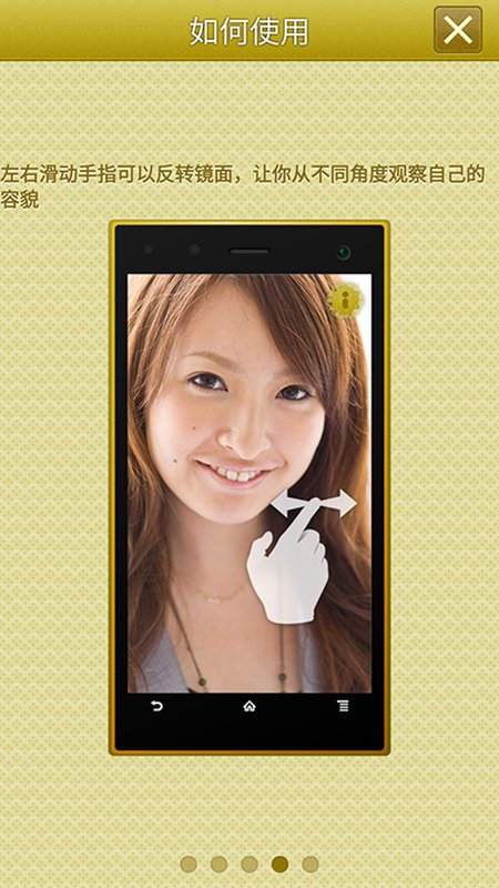 打开应用后,整个屏幕呈现镜子效果。若要调节亮度,向上或向下滚动屏幕;想切换扭转镜面,点击屏幕左右;需检查头皮和脑后面,点击屏幕暂停;化妆时可使用变焦功能;想了解皮肤真实年龄,使用测年龄功能;遇到危险情况女孩可使用报警功能快速报警。