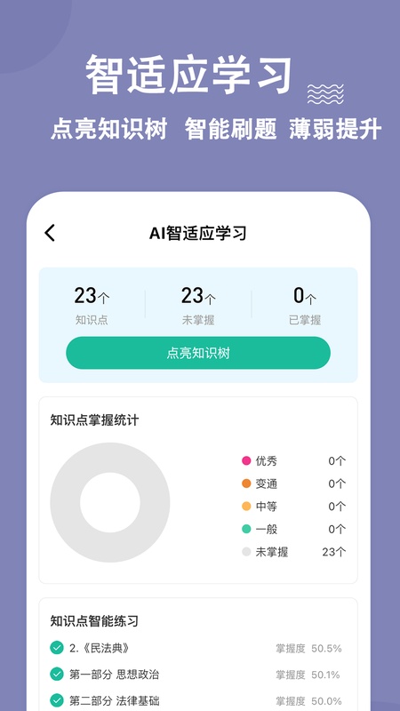 【AI智适应学习】根据学员的刷题数据,自动检测你的知识漏洞和薄弱项,给你抽取对应题目,确保每个知识点都能覆盖,帮你大量节约时间,提升备考效率。