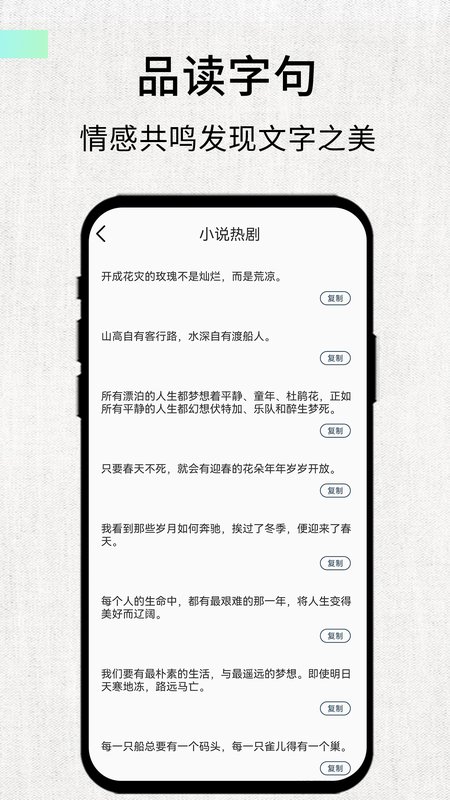 素记提供海量精美文案素材,有每日一句,每天提供一分钟早安语录,用户可一键复制记录美好心情语录;具备精彩文案素材功能,可快速收藏转瞬即逝的创意,这里有严肃、励志、唯美、心动等多种类型的文案句子;包含作文题材,有名人名言、好词好句、金句诗词、优美句子等摘抄以及作文体裁等;有素材卡片,可随时随地收藏、摘抄、学习、运用佳句卡片;还有海量范文,对范文条条解读,有小学、中学、高中各类题材作文,同时提供写人、写事、写景、记述等写作素材。