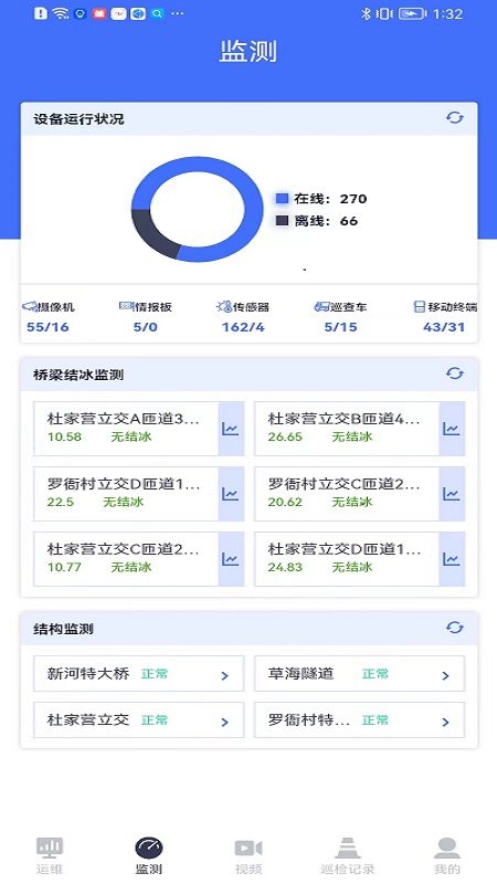 该APP旨在整合运营高速的位置信息、结构数据、路网数据、图像视频数据、交通流量数据、结冰监测数据、路况巡检数据、桥隧结构健康监测数据、视频AI识别数据,打造智能运营监控+智能监测养护体系;形成“路况巡检-发现病害-病害分发-施工养护-效果评估”养护工作闭环。 软件功能
