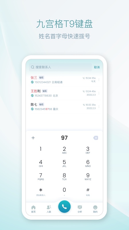 1. 九宫格T9键盘:支持姓名首字母快速拨号,让拨号操作更加便捷。