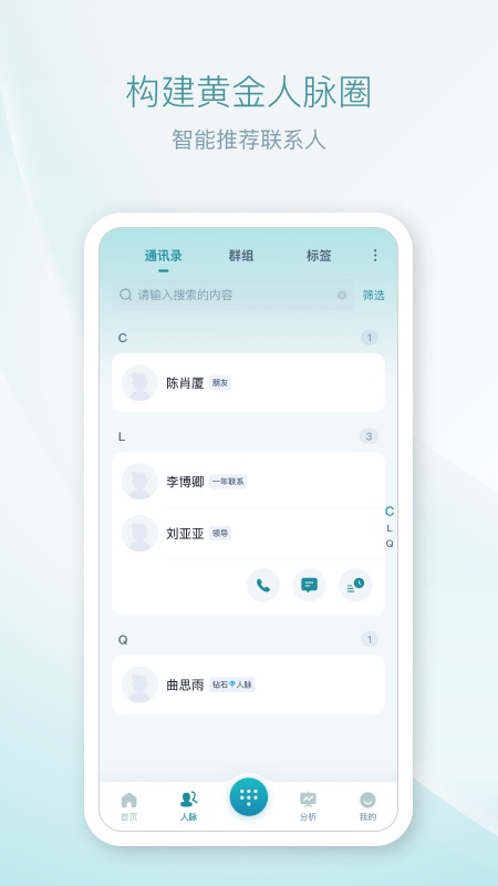 无广告绿色安全!依据155法则,通过多维度分析通话数据智能推荐联系人、并定期提醒,助您打造构建黄金人脉圈。本App拥有多项快速智能操作及自动化批处理工具,致力于提升您的沟通效率!