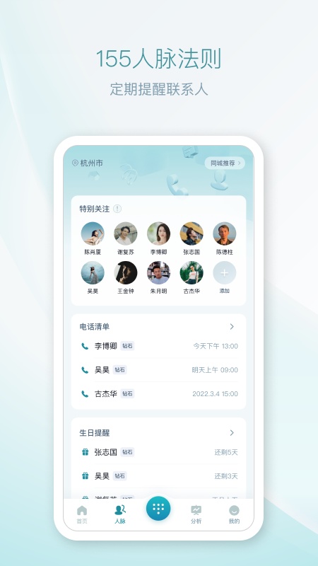 4. 155人脉法则:定期提醒联系人,帮助用户维护人脉关系。