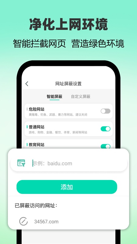 网址屏蔽:科学智能拦截不良网址,让含有不良信息网站无缝可入,还可以自定义网址黑白名单,灵活方便