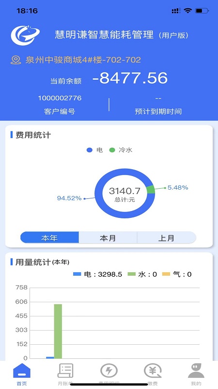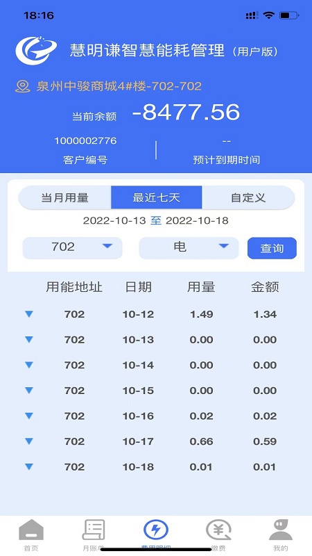 慧明谦智慧能耗管理(用户版)方便用户在线查询水、电、气账单,支持查询任意时段费用明细,用户能耗消费一目了然。