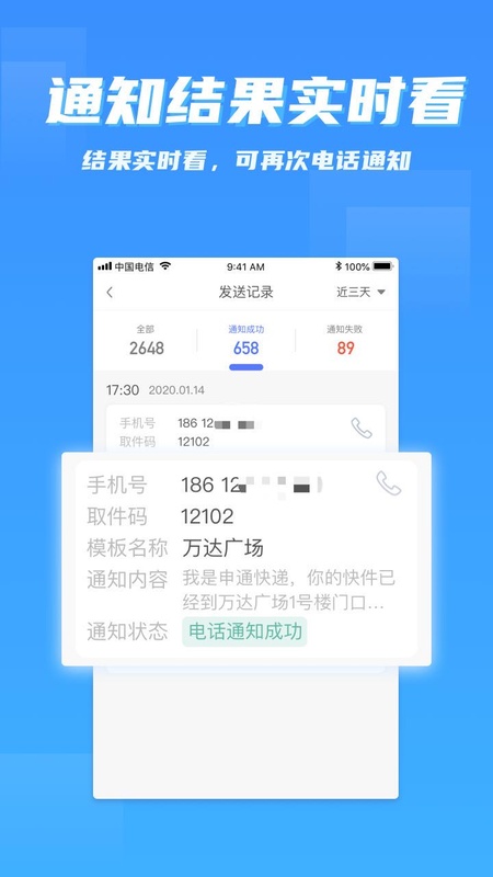 可支持以韵达、申通、圆通、中通、百世、天天、邮政、顺丰、菜鸟驿站等数十家快递公司名义发送取件通知。