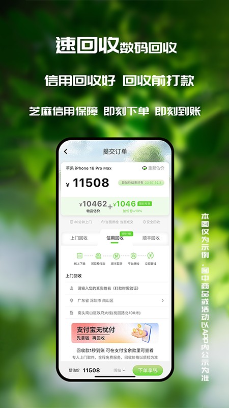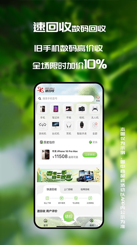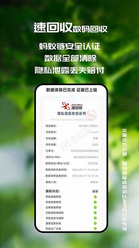 速回收App快速估价、专业质检、极速打款、全程录像可供您查看,为用户提供高质量高价的回收服务,并有数据粉碎、隐私安全保障。