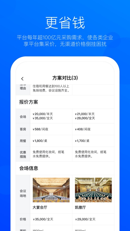 -更高效:5秒提交会议需求,全国智能酒店供应链快速响应,28分钟获在线招标方案。办会、采购效率大大提升。使会议高频的企业,整体工作大幅度提效。