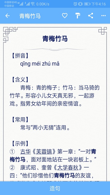 平台的优势明显,离线数据库的存在让用户无需联网也能查询成语,方便随时随地学习。丰富的成语收录量为用户提供了大量的学习资源。详细的成语信息能让用户全面了解成语知识。多样的搜索方式满足了不同用户的查询需求,无论是知道拼音、笔画,还是想按字数、分类查找都可以实现。成语填空和每日造句功能有助于用户在实践中提升对成语的运用能力。实用的收藏和阅读功能方便用户整理和回顾学习内容。自定义排版功能能根据用户的喜好进行个性化设置,提升学习体验。