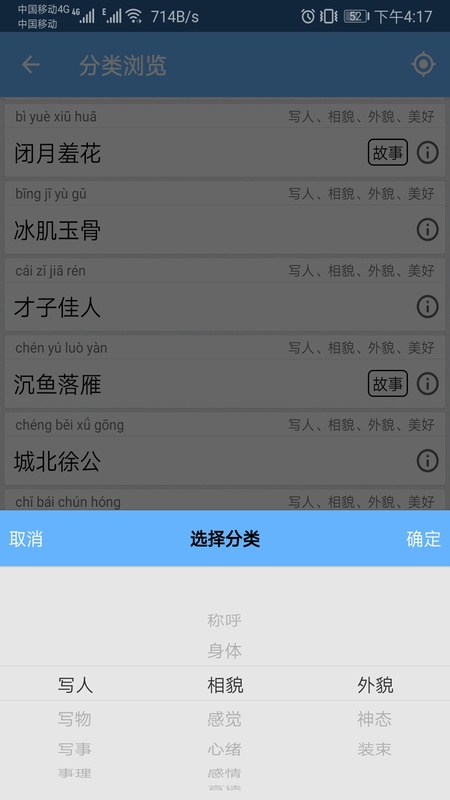 拼音搜索、笔画搜索、字数搜索、成语分类、成语故事。
