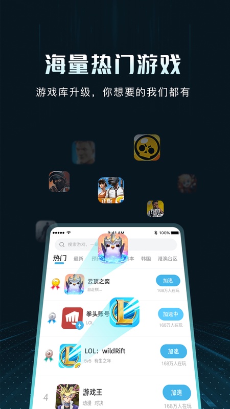 支持英雄联盟手游(lol:wild rift)、云顶之弈手游(teamfight tatics)加速及账号注册,热门手游第一时间更新!