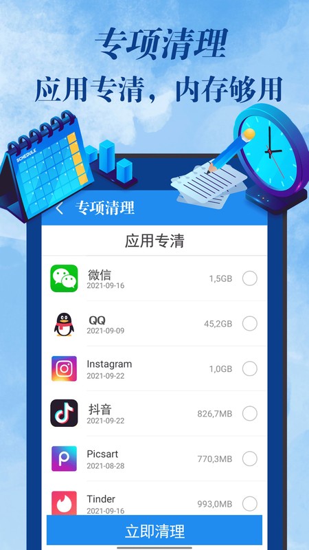 快速释放手机记忆体,解决系统卡顿和手机空间不足问题。