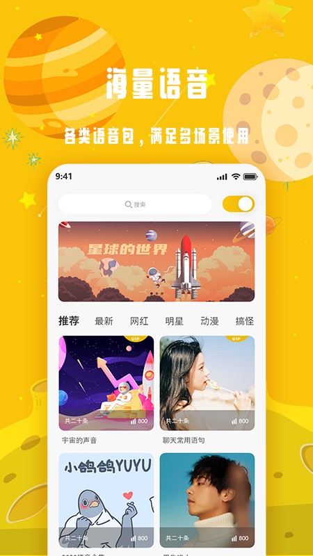 变声星球,一款拥有多种变声音效的app,海量录音特效丰富又好玩,采用全新变声算法来调整音色,果音高,基频,系统预设包括小男孩,小女孩,男女青年,男女中年等变声音效,变声效果丰富自然。