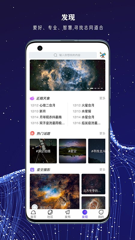 爱天文社区致力于通过天文摄影让更多人了解、喜欢天文,是国内专业的天文爱好者交流平台,平台为爱好者提供了天象日历、观测条件等快捷工具,只要您喜欢天文、热爱星空,爱天文社区是你精神寄居的不二选择。 功能特色