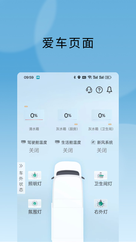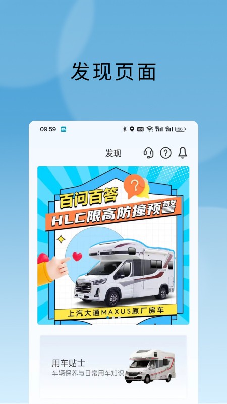 集车况显示、车端近场控制、远程控制及远程安防功能于一身,可实现用户与房车各设备间的互联互通,提供无障碍交互与操控体验,还具有用车贴士、售后维保、预约试驾、在线客服等服务模块。