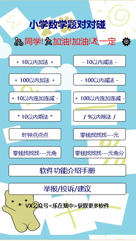 --软件涵盖了10以内的加法,减法,除法和乘法, 100以内的加法和减法,帮助打牢小学数学基础,培养孩子的学数学兴趣.