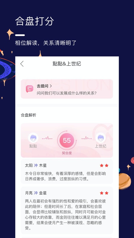 口袋占星App为星座爱好者提供专业在线星盘工具和陪伴服务。具备本命星图功能,星盘可自由使用,用户能借助它解答人生疑问,如何时脱单、职场选择是否合适等。还有双人合盘功能,能对两人契合度进行打分,让结果一目了然,还可询问感情走向相关问题,如是否是天生一对、何时步入婚姻、如何跨过感情坎儿等。