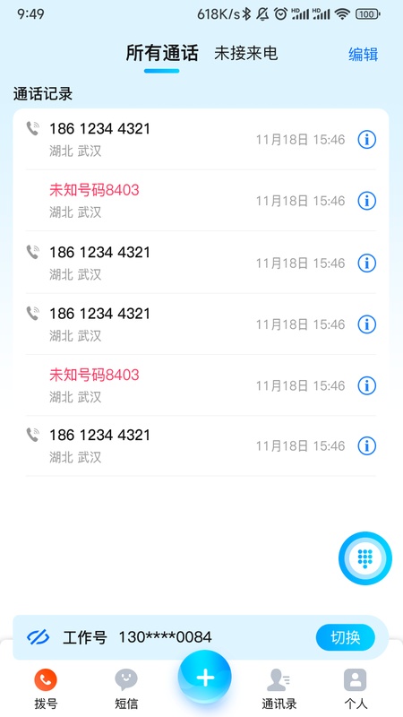 使用APP打电话或送短信是沃号通号码,使用手机打电话或发短信是个人号码;