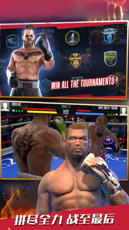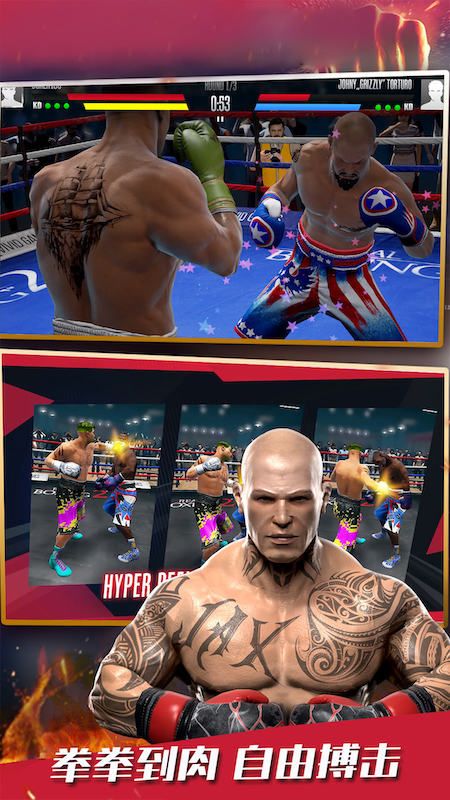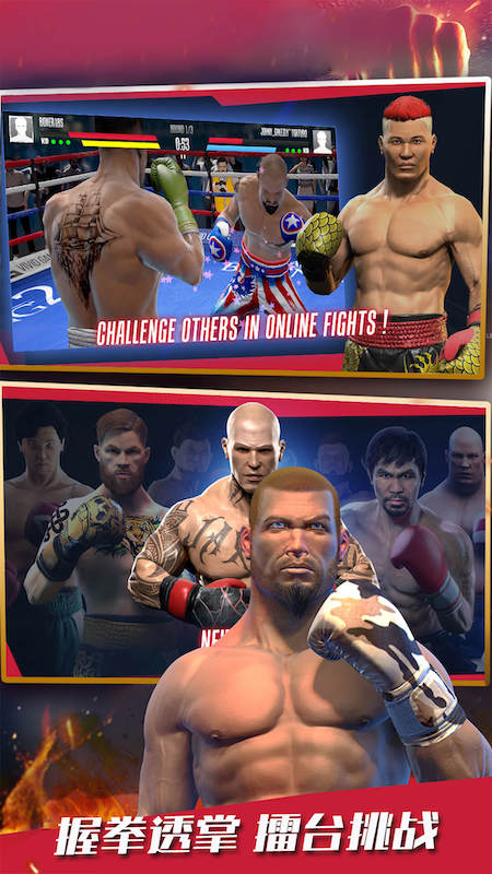 玩家进入游戏后,可先按照自己的喜好为拳击手定制鞋子、纹身等外观细节。之后开启游戏,就能体验融合了真实职业拳击手动作特点和现实物理效果的拳击对战。