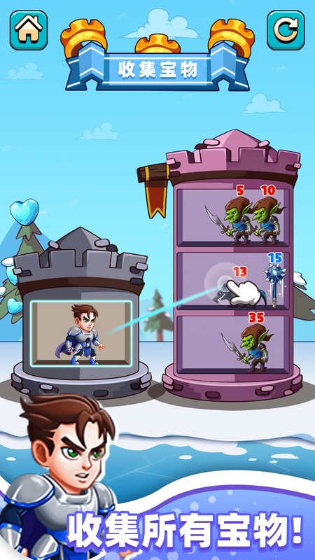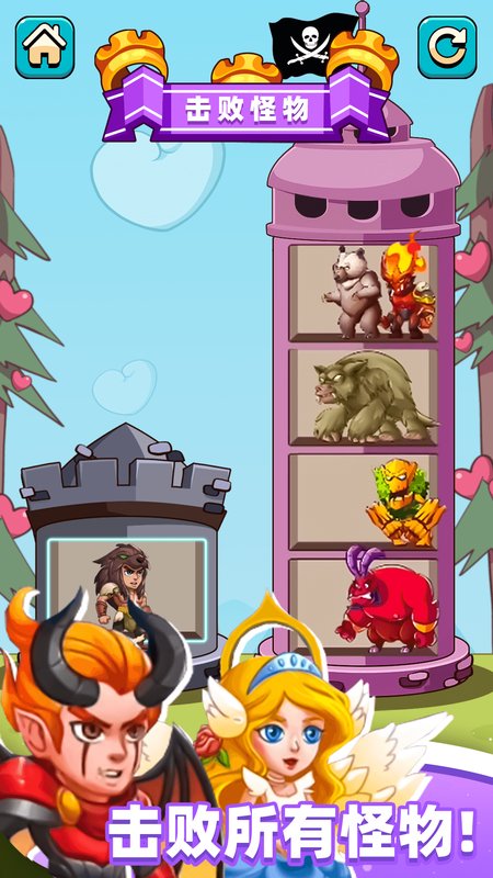 玩家可扮演勇敢男人站在塔顶挑战成群小怪,每击败一个小怪能获取其生命值,可用于恢复自身生命或增强战斗力。通过PK击败更强小怪来解锁新技能和装备,目标是解救被囚禁的公主。