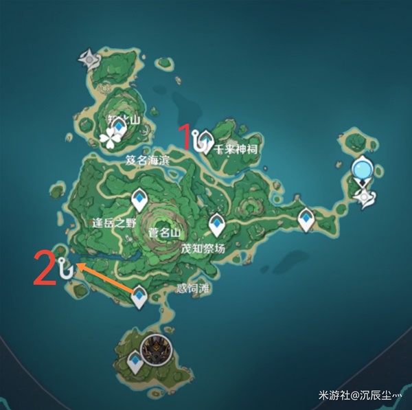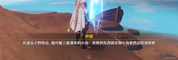 与其对话后得知,要去逢岳之野的西边,面对三重瀑布的小岛上。也就是上图的2位置。